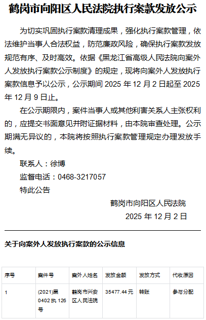 鹤岗市向阳区人民法院执行案款发放公示