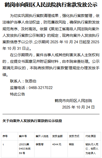 鹤岗市向阳区人民法院执行案款发放公示