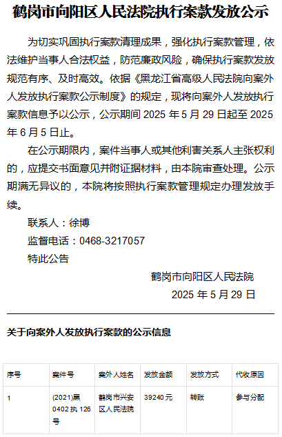 鹤岗市向阳区人民法院执行案款发放公示