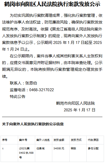 鹤岗市向阳区人民法院执行案款发放公示