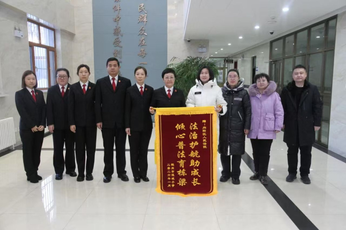 锦旗载誉,认可为帆。身为法治副校长,向阳区人民法院始终铭记:未成年人是祖国未来,校园普法是护苗基石。未来,我院将创新形式、丰富内容,让法治课堂鲜活入心,让法律知识化作学子成长铠甲,让法治精神在校园生根结果,护航青春远航,共绘平安法治校园新篇。